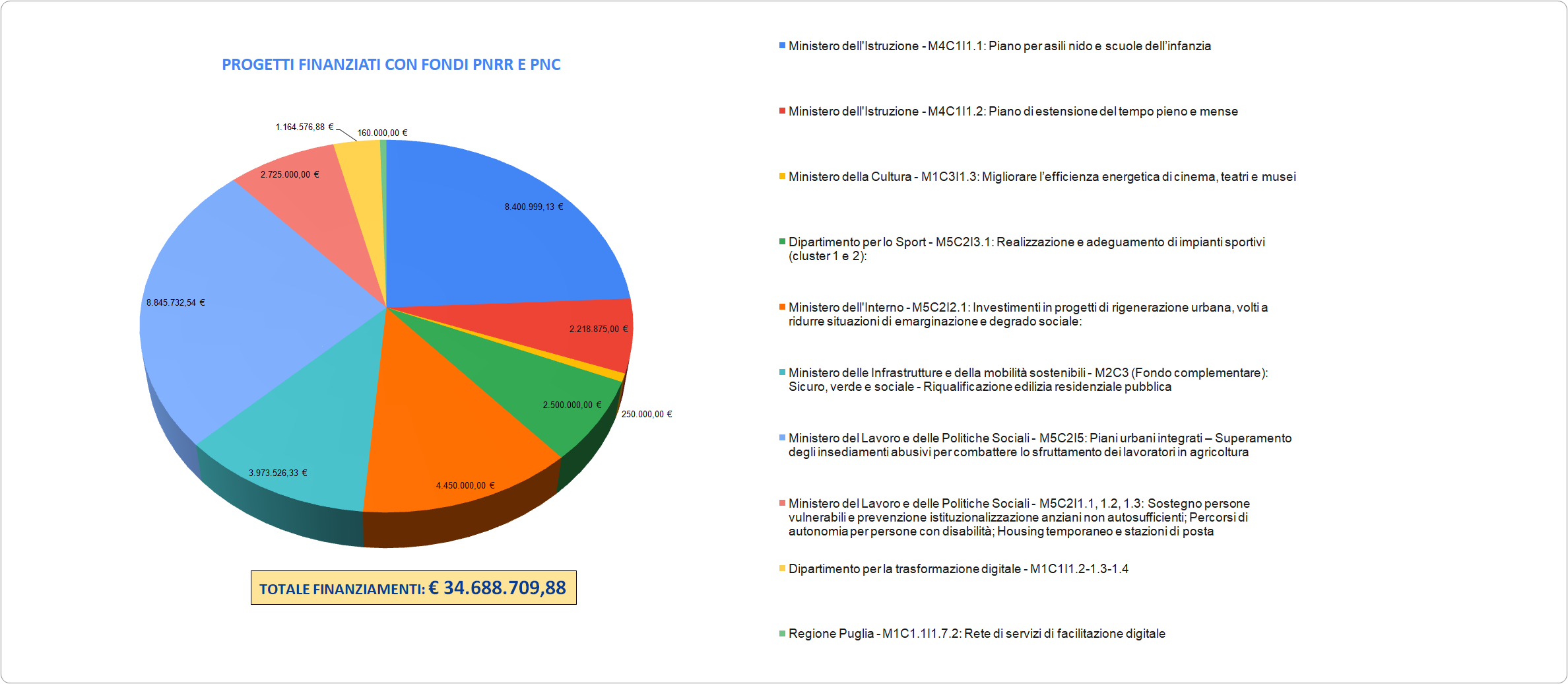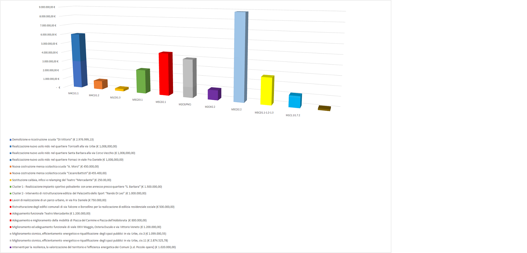 Di seguito, i grafici relativi alla proposte progettuali per le quali l’Amministrazione ha già ottenuto i finanziamenti a valere sui fondi PNRR.