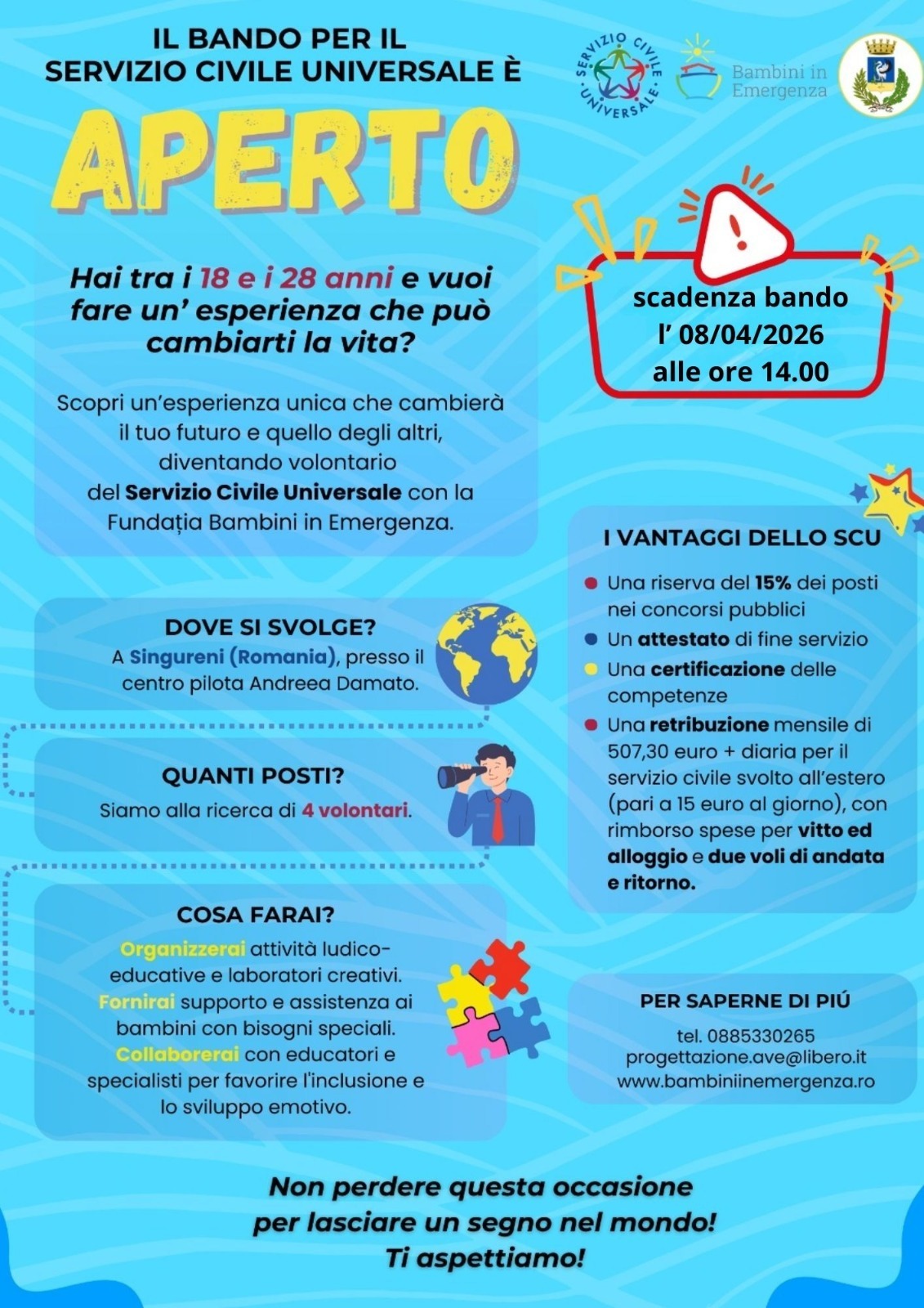 FUNDATIA BAMBINI IN EMERGENZA quale Ente di Accoglienza del Comune di Cerignola per il Servizio Civile Universale è coinvolto nel seguente progetto: