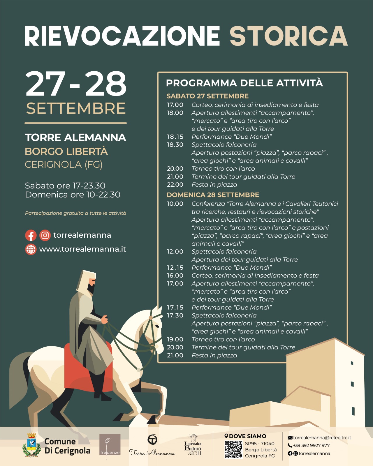 👉 La “Rievocazione storica” è patrocinata dal Comune di Cerignola ed è organizzata in collaborazione con la cooperativa sociale Frequenze, ente gestore di Torre Alemanna, e con l’associazione storico-culturale Imperiales Friderici II.