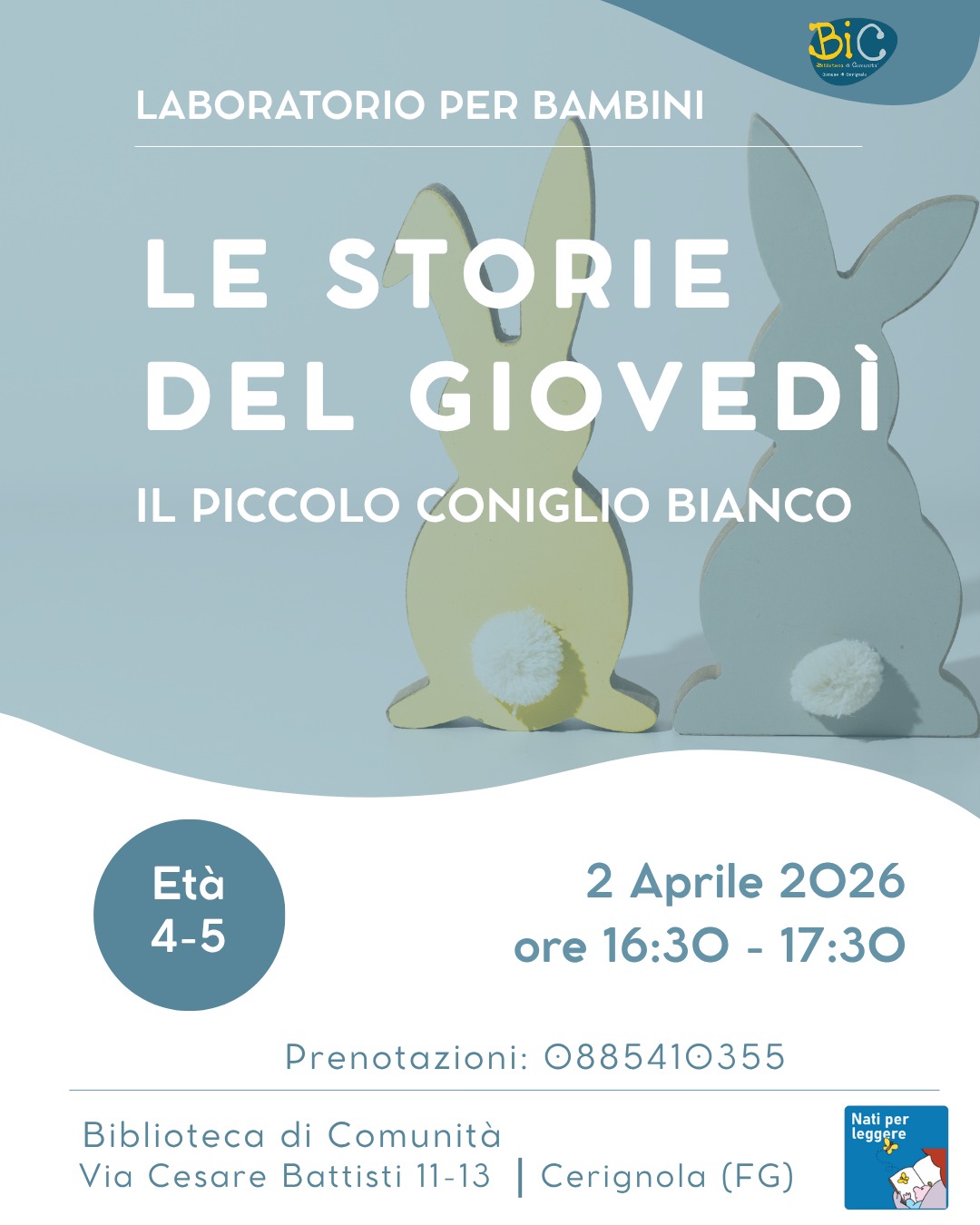 In occasione della Pasqua, la Biblioteca di Comunità organizza un laboratorio ispirato alla dolce storia del Piccolo Coniglio Bianco! 🌸🥚